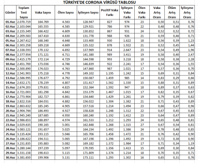 Bu tarihten itibaren Haziran ayında Türkiye’deki Korona Virüs salgınındaki son durum şöyle;