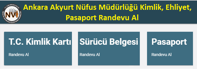 Ankara Akyurt Nüfus Müdürlüğü Kimlik, Ehliyet, Pasaport Randevu Al. Nüfus ve Vatandaşlık İşleri Genel Müdürlüğü (NVİ) Ankara Valiliği Nüfus ve Vatandaşlık İl Müdürlüğüne bağlı Akyurt Kaymakamlığı Nüfus ve Vatandaşlık İlçe Müdürlüğünden Türkiye Cumhuriyeti Kimlik Kartı (TCKK), Ehliyet (Sürücü Belgesi) ve Pasaport (Yeşil Pasaport, Gri Pasaport, Bordo Pasaport) çıkartmak, değiştirmek, yenilemek, uzatmak ve kayıp nedeniyle yenisini almak isteyen vatandaşlarımız aşağıdaki linklerden randevu.nvi.gov.tr adresine ulaşarak randevularını alabilirler.