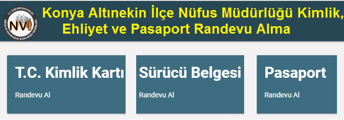 Konya Altınekin Nüfus Müdürlüğü Kimlik, Ehliyet, Pasaport Randevu Al. Nüfus ve Vatandaşlık İşleri Genel Müdürlüğü (NVİ) Konya Valiliği Nüfus ve Vatandaşlık İl Müdürlüğüne bağlı Altınekin Kaymakamlığı Nüfus ve Vatandaşlık İlçe Müdürlüğünden Türkiye Cumhuriyeti Kimlik Kartı (TCKK), Ehliyet (Sürücü Belgesi) ve Pasaport çıkartmak, değiştirmek, yenilemek, uzatmak ve kayıp nedeniyle yenisini almak isteyen vatandaşlarımız aşağıdaki linklerden randevu.nvi.gov.tr adresine ulaşarak randevularını alabilirler.