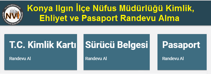 Konya Ilgın Nüfus Müdürlüğü Kimlik, Ehliyet, Pasaport Randevu Al. Nüfus ve Vatandaşlık İşleri Genel Müdürlüğü (NVİ) Konya Valiliği Nüfus ve Vatandaşlık İl Müdürlüğüne bağlı Ilgın Kaymakamlığı Nüfus ve Vatandaşlık İlçe Müdürlüğünden Türkiye Cumhuriyeti Kimlik Kartı (TCKK), Ehliyet (Sürücü Belgesi) ve Pasaport çıkartmak, değiştirmek, yenilemek, uzatmak ve kayıp nedeniyle yenisini almak isteyen vatandaşlarımız aşağıdaki linklerden randevu.nvi.gov.tr adresine ulaşarak randevularını alabilirler.
